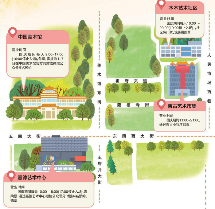不必远行,就留在艺术的世界里雕刻时光吧。王府井大街与五四大街交叉十字路口,是北京最具艺术氛围的十字路口。中国美术馆、嘉德艺术中心、木木艺术社区(与隆福寺文化中心在同一个院落)分别占据着十字路口的一角,以各自独立的调性满足寻找美的眼睛。