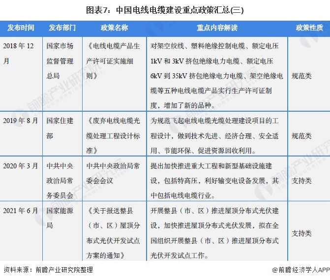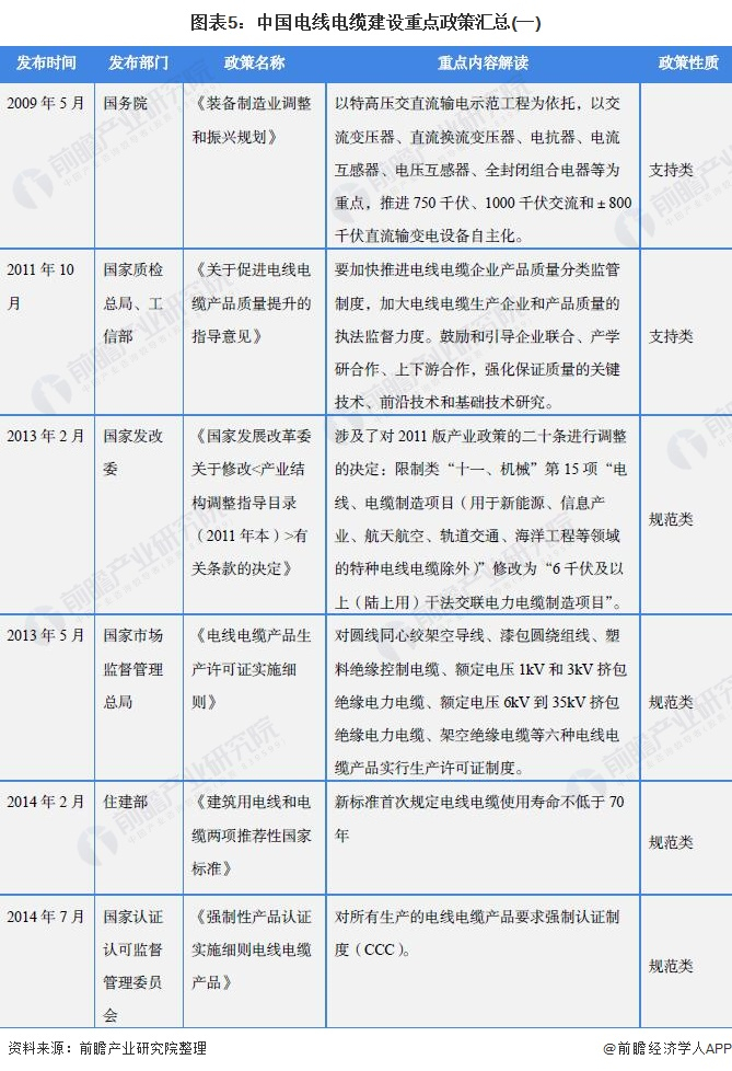 自2009年以来,国务院、国家发改委、国家住建部国家能源局等多部门都陆续印发了支持、规范电线电缆行业的发展政策,内容涉及推进电线电缆技术研究、电线电缆建设规范、电线电缆企业安全运行规范等内容: