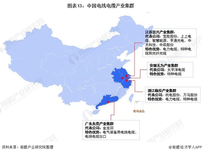 从电线电缆产业集群来看,我国电线电缆行业已形成以江苏宜兴、浙江临安、安徽无为、广东东莞等为代表的产业集群。上述主要的产业基地均位于我国东部经济总量大、电力建设投入高的省份,相互竞争又各有特色,如宜兴的电力电缆和特种电缆,无为的特种电缆和广东的电缆出口等。