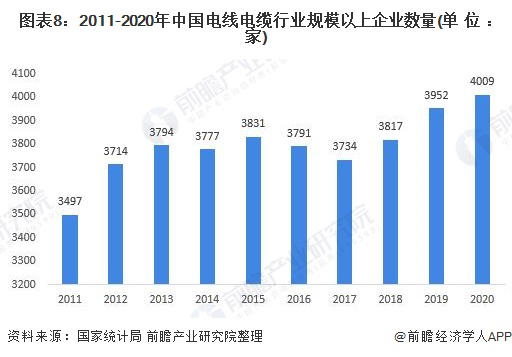 根据国家统计局的数据显示,2011-2015年,随着电线电缆行业规模不断壮大,行业内规模以上企业数量呈不断上升趋势,2015年达到3831家,为历年来的最大值。2017年随着行业调整,产品升级、落后产能淘汰加快,行业并购整合速度加快,行业规模以上企业数量有所下降,为3734家,较2016年减少了57家。随着我国对于新能源和基建的投入,2018-2020年全国电线电缆行业开始逐渐回暖,规模以上企业数量由3817家左右上升至4009家。
