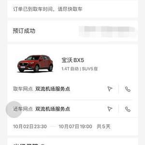 10月3日,姜先生向澎湃新闻(www.thepaper.cn)反映,他通过神州租车预订于昨天(10月2日)23时在四川成都双流机场服务点租用一辆宝沃BX5汽车,订单显示预订成功。然而,昨晚他按照订单信息到达该服务点准备取车时,却被在场的工作人员告知无车可用,而此前他并未接到任何通知。除他之外,另有几名游客也遇到类似的情况。