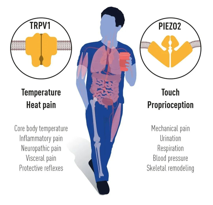 今年的诺贝尔奖得主对TRPV1、TRPM8和Piezo通道的突破性发现,让我们了解了热、冷和机械力如何触发神经冲动,使我们感知和适应周围的世界。TRP通道是我们感知温度能力的核心。Piezo2通道赋予我们触觉和感知身体部位位置和运动的能力。TRP和Piezo通道还有助于许多额外的生理功能,依赖于感知温度或机械刺激。来自今年诺贝尔奖的发现的深入研究集中在阐明它们在各种生理过程中的功能。这一知识正被用于开发各种疾病的治疗方法,包括慢性疼痛。