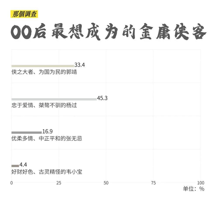 整天操心家国大业的侠界模范郭靖不再是年轻人的头号偶像,45.3%的00后更渴望成为杨过一样敢冒天下之大不韪的叛逆浪子。