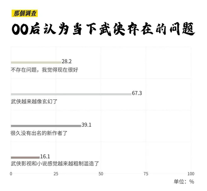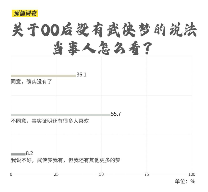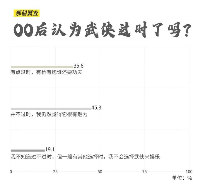 三分之二00后受访者在问卷中斩钉截铁地表示,“武侠并不过时,我仍然觉得它很有魅力”,只有四分之一的受访者认为“武侠有点过时”。