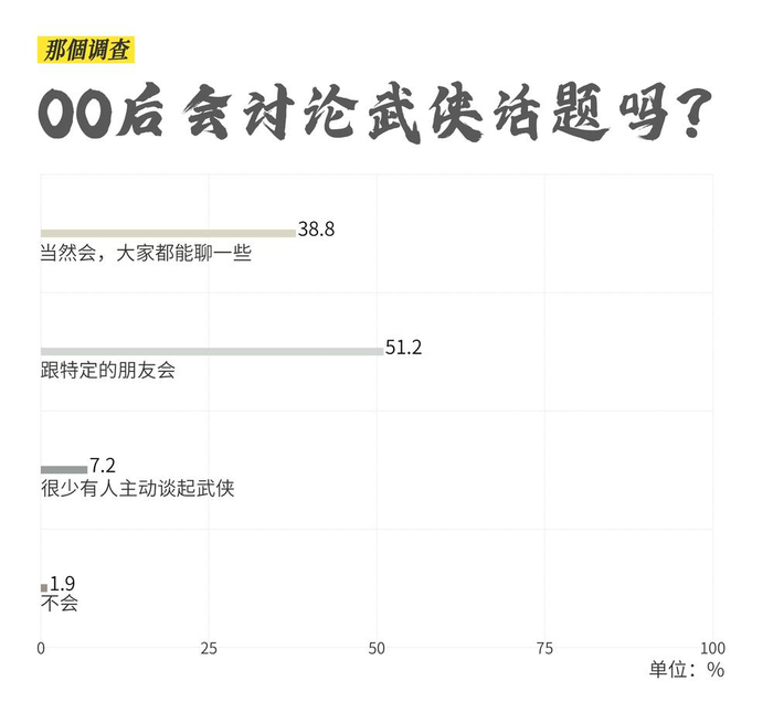 超过一半受访者发现,身边很少有人谈论武侠,近四成人只和特定朋友聊武侠,仅有一成受访者仍然感觉武侠是个大众话题。