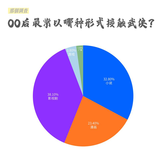 38.1%受访者表示,影视剧平常看得最多,23.4%受访者常看漫画,32.8%常看小说。以影视剧和漫画为主的图像载体完全超越文字载体,成为00后武侠世界的不二主角。