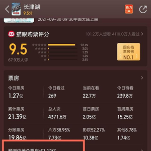 10月4日晚,上映5天的《长津湖》票房冲破20亿关口,猫眼票房随即把该片的总票房预测上调了一个亿,这个数字目前是51.12亿。一路高奏凯歌的《长津湖》极大提振了中国影市的信心。