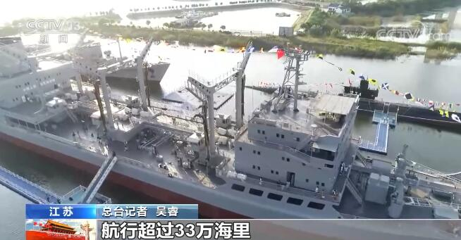总台记者 吴睿:现在最受关注、最受欢迎的就是我身后这艘881洪泽湖号综合补给舰。这是我国自主设计建造的第一代综合补给舰,它在服役的38年中,航行超过33万海里,去过26个国家的29个港口,还创下了我舰艇编队“首次环球航行”“首次穿过巴拿马运河”等16项壮举,被誉为“中华补给第一舰”。
