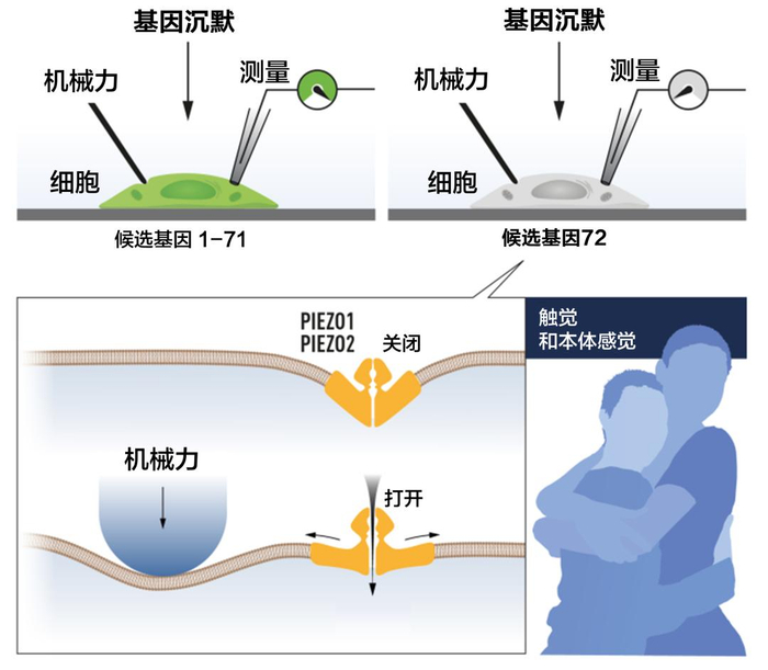 帕塔普蒂安和同事首先识别出了一种细胞系:当用微量移液管插入某单个细胞时,该细胞系会发出可测量的电信号。他们假设机械力激活的受体是一个离子通道,并在下一步中识别出72个编码潜在受体的候选基因。他们逐一令这些基因失活,以发现这些细胞中负责机械敏感性的基因。经过艰苦的搜寻,帕塔普蒂安和同事成功地识别出了一个单一基因,该基因沉默时,细胞对微量移液管的戳刺不再敏感。由此,他们发现了一种全新的、完全未知的机械敏感离子通道,并以希腊语单词“压力”(píesi)将其命名为PIEZO1。依靠与PIEZO1的相似性,第二个基因被发现并命名为PIEZO2。他们发现感觉神经元表达了高水平的PIEZO2,同时进一步的研究证实,针对施加在细胞膜上的压力,Piezo1和Piezo2是可以被直接激活的离子通道。