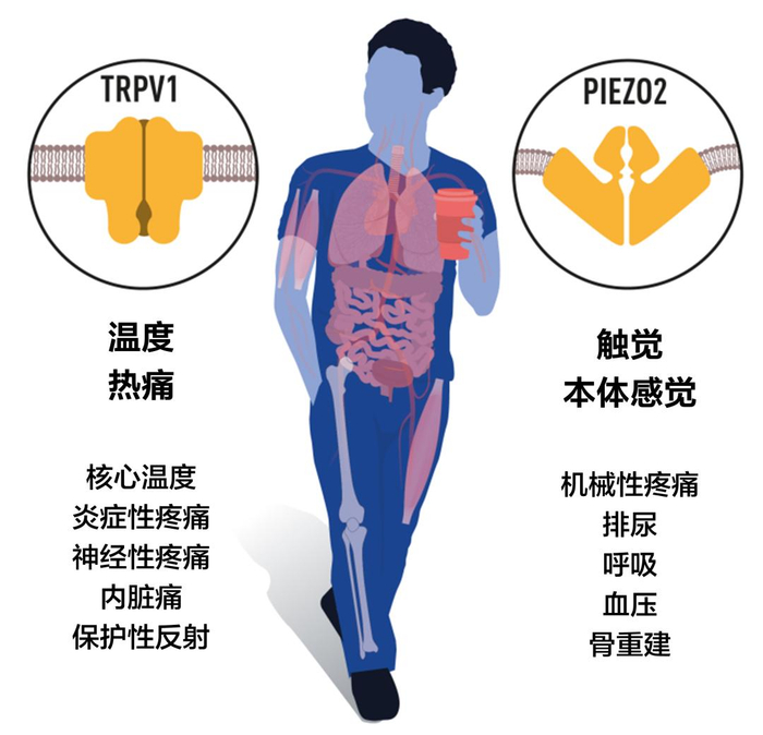 今年诺贝尔生理或医学奖获得者大卫·朱利叶斯及阿德姆·帕塔普蒂安对 TRPV1、TRPM8 和Piezo通道的突破性发现,使我们理解了热、冷和机械力如何触发神经冲动,从而让我们能够感知和适应周围的世界。TRP通道是使我们能够感知温度的核心。