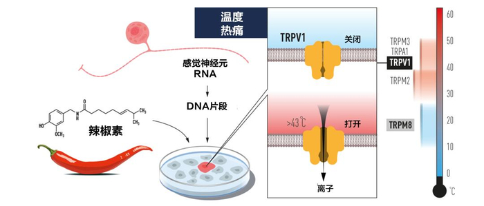 20世纪90年代后半,大卫·朱利叶斯在美国旧金山的加利福尼亚大学工作。他意识到,通过分析辣椒素如何使我们碰触辣椒时感到灼热感,或许可以取得重大科学进展。那时,人们已经知道辣椒素可以激活神经细胞、造成痛感,但是辣椒素发挥作用的机制仍是未解之谜。朱利叶斯和同事们一起建立了包括数百万DNA片段的文库。这些DNA片段,对应着能对疼痛、热和触碰产生反应的神经细胞中表达的基因。朱利叶斯和他的同事们假设这些DNA片段中有一段编码了可以与辣椒素反应的蛋白质。他们将文库中的DNA片段逐个导入本身不会对辣椒素产生反应的细胞中,使它们在培养的细胞中表达。经过辛苦的搜寻,一段单独的基因被识别了出来,它可以让细胞变得对辣椒素敏感。他们找到了负责感受辣椒素的基因!后续的实验表明,识别到的基因编码了一种新的离子通道蛋白,这一新发现的辣椒素受体蛋白后来被命名为TRPV1。当朱利叶斯进一步研究这种蛋白对热的反应,他意识到他发现了热感觉受体。当温度达到令人疼痛的程度时,这些受体会被激活。
