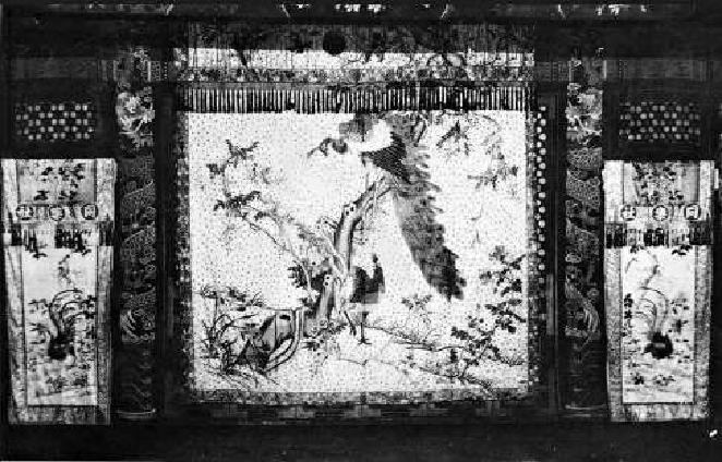 守旧就是过去老戏园子舞台上最后悬挂的底幕。一幅缎制有绣活儿的大幕遮挡住观众的视线,成为前后台的分水岭。老戏园子舞台的最后是一道木板墙,左右挖两个洞,缎制的底幕挂上去,开洞处左右各开一个门框,上面有两副门帘,左边绣“出将”,右边绣“入相”,作为演员的上下场门。大的京剧艺术家都有自己的特制守旧,如梅兰芳大师的缎制,中间绣有两只栩栩如生的孔雀,四周有许多飞翔的喜鹊。这是梅大师亲手所绘,放大后再绣上去的。如今已成一件文物,非常珍贵。当年马连良先生演戏的守旧,米黄色缎制,中间绣棕色梁武帝祠车、马、人图案,古色古香,非同一般。