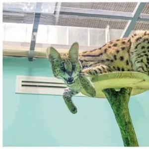 记者在北京市大兴区的北京野生动物园救护站里看到,一只躯干纤细、四肢修长的薮猫,时而趴在专门为其搭置的梯架上休息,时而站起来伸伸懒腰或者下到地面散步。