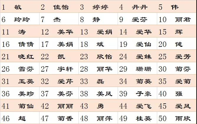 全县常住人口中,名字使用频率最高的10个字依次为: