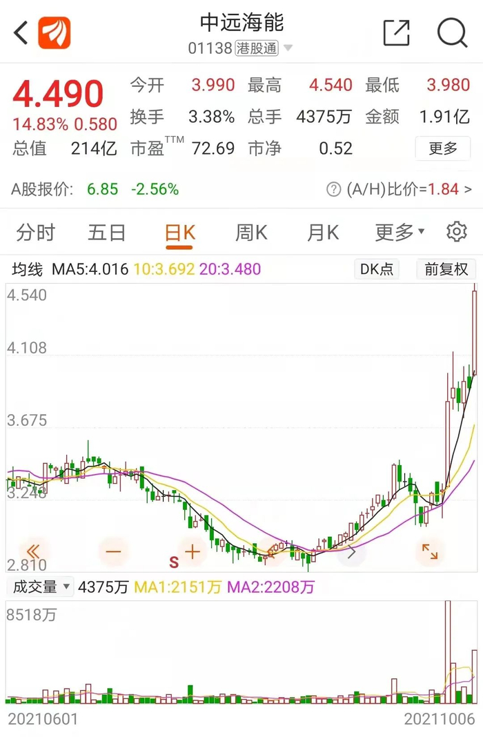 以能源运输为主营业务的中远海能(01138)今日大涨14.83%,最新股价收于4.49港元,9月以来涨幅接近50%。