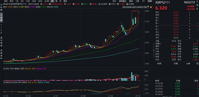 美国天然气市场同样大涨,主力11月合约价格收报6.33美元/百万英热单位,涨幅为9.78%。今日亚洲交易时段窄幅波动,至截稿时收报6.32美元附近。