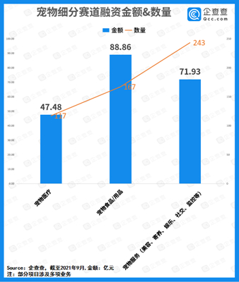 企查查宠物项目中融资金额排名显示,截至2021年9月,波奇宠物融资13.04亿元居首,其次是依依股份的10.26亿元。截至2021年9月,细分赛道的融资金额显示,宠物食品/用品融资金额达到88.86亿元,宠物服务(美容、寄养、娱乐、社交、监控等)达到71.93亿元,而宠物医疗融资金额为47.48亿元。
