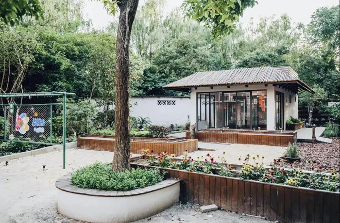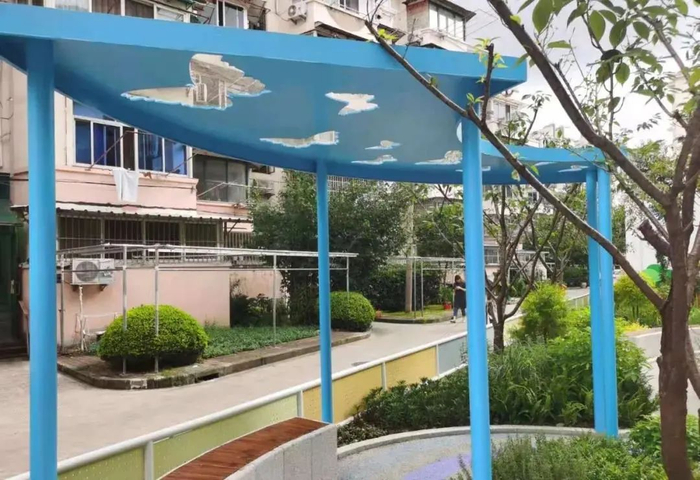 五园三亭生境花园全园采用无障碍设计,廊亭下翻新固定式座椅,增加移动式可拼接座椅和黑板宣传栏,满足居民不同的使用需求。