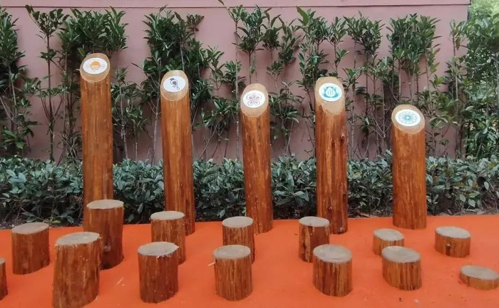 穿过花园门口的居民种植区,三面落地玻璃门的金虹小筑宽敞明亮。右侧是枯木游戏场,架成“平衡木”小游戏的树桩树干错落摆放,小区废弃枯树巧妙地在游戏场重新“焕发生机”。而左侧的常馨秘境里,碎裂的旧混凝土块“无序”排放,缝隙中洒下特意寻来的各种珍贵种子,糠稷、佛甲草、蒙古蒲公英、看麦娘等十几种本土植物自然丛生,俨然一个迷你版的百草园。