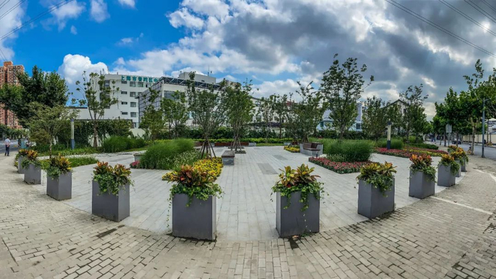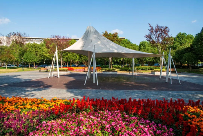 在路口转角、广场节点处布置花境,提供步移景异的户外林下活动空间。保留祁连山南路沿路原有成排的落羽杉乔木风貌,新种纳塔栎、无患子、香泡等“四化”木本植物。待春暖花开,新梢鸟儿迎风唱,再盼景观廊架上凌霄挂朵,可谓“风暖鸟声翠,闲待花满廊”。