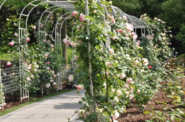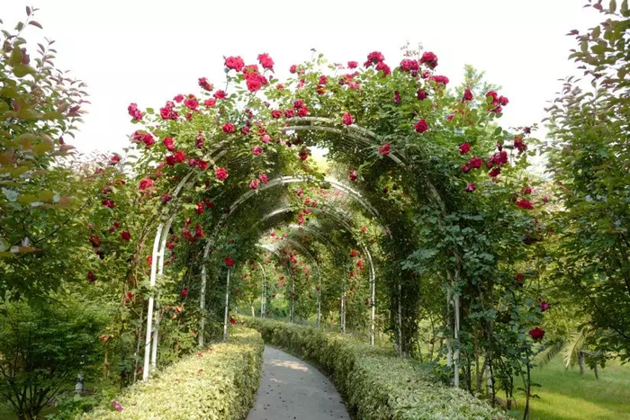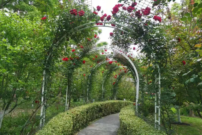 月季园拱门处重做白色铁艺廊架,栽培藤本月季红色“御用马车”和粉白色“龙沙宝石”,打造如梦如幻、香气浓郁的拱门形花廊。