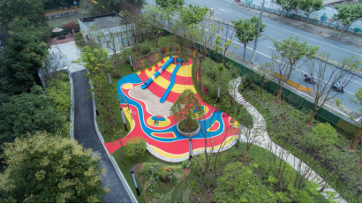 彩丘园绿面积约2800平方米。绿地与桃浦公园隔河相对,集休闲广场、儿童活动、健身花径与丰富植物为一体。在彩丘园入口处的街角广场种植一丛樱花林,采用异形坐凳配以蓝色系马赛克拼贴,提升游园乐活氛围;而主草坪花境区域则种植绣球、百子莲、醉鱼草、矾根等植物品种,多季有景,缤纷烂漫。此外,绿地内还为儿童打造了一块专属的“彩丘乐园”,以沙坑与彩色塑胶面层作为主基调,配有滑梯、攀岩、趣味钻洞等游憩设施。