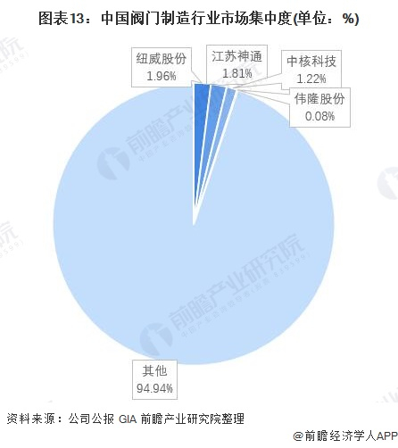 由于我国阀门制造业产出产品的技术要求不高,行业整体的资金壁垒、技术壁垒、政策壁垒等因素均相对较低,因此我国阀门制造行业参与者较多,在中低端阀门市场呈现完全竞争态势。而在我国阀门制造行业的上市企业中,纽威股份(603699)处于绝对龙头地位。2020年,纽威股份的营业收入为36.32亿元,其中国内销售收入17.14亿元,占总营业收入的47.48%,但内销收入在国内阀门制造行业内企业总营业收入的占比仅为1.96%。