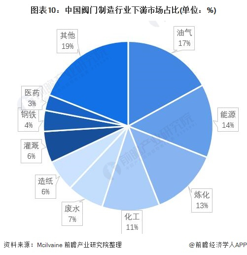 阀门是现代工业建设体系中的关键设备之一,几乎所有建筑项目、控制系统等工程中均有应用。因此,阀门广泛的应用于各个工业细分领域。目前,主要的阀门应用领域包括:石油天然气、电力、化工、自来水和污水处理、造纸、冶金、制药、食品、采掘、有色金属、电子等行业。其中,石油天然气、能源电力和炼化、化工领域是阀门最重要的应用领域。根据Mcilvaine的统计,在阀门的下游需求市场中,包含钻采、运输和石化在内的石油天然气领域占比最高,达到17%;其次是能源电力的需求,占据了阀门下游市场需求的14%;排名第三第四的下游领域分别为炼化与化工,占比分别为13%与11%。前四大领域的市场需求合计占全部市场需求的55%。
