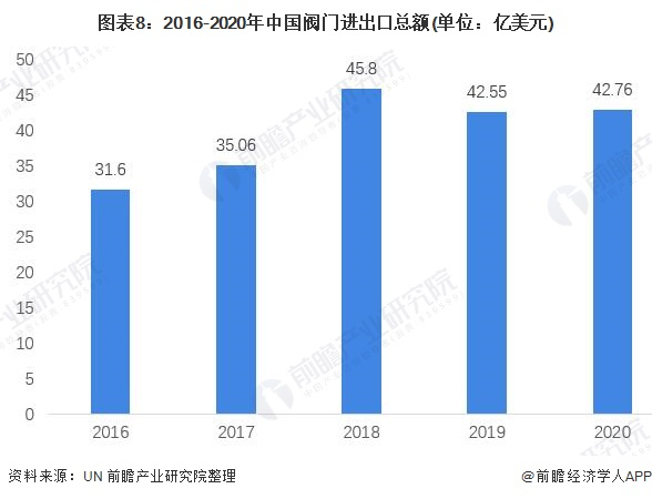 横向来看,2016-2020年我国阀门制造业进出口呈现波动上升趋势,从2016年时的31.6亿美元上升至2020年的42.76亿美元,上升幅度为35.31%。