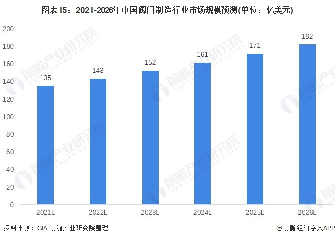 根据GIA的预测数据,2021-2026年,我国阀门制造行业年复合增速为6.2%,预计到2026年末,我国阀门制造市场规模能够达到182亿美元,较2020年上升43.47%。
