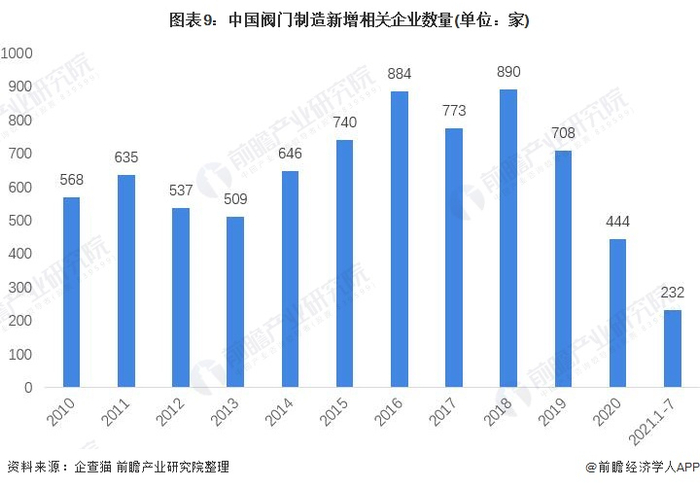 以成立时间为限来看,我国近年来阀门制造企业新增数量逐渐增多,呈不断递增态势。2010年以来,年均新增670家左右。其中,2018年增速最高,单年新增890家相关企业。截至2021年7月30日,2021年共计新增232家企业。