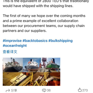 “当因为目前的海运危机而无法获得集装箱或舱位时,我们不得不跳出思维定势(或集装箱)。”艾伦·斯密斯解释道。