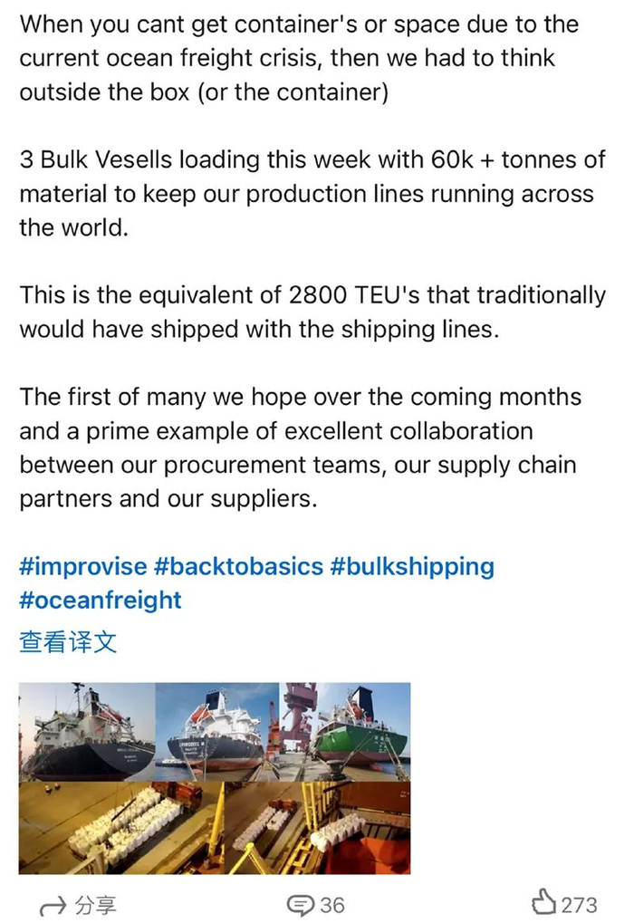 可口可乐公司采购总监艾伦·斯密斯(Alan Smith)日前在社交平台上表示,因为无法获得集装箱和舱位,可口可乐公司不得不租用三艘小型散货船,用于原料运输以保障其在全球范围内生产线的正常运行。