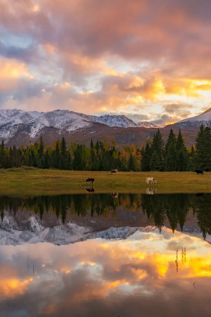 天山脚下的野果林,荒漠里的胡杨树,夹杂着树林的草原……