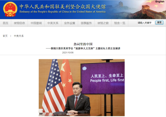 据中国驻美国使馆网站消息,当地时间10月6日,中国驻美大使秦刚应邀在线出席由美国美亚学会和金沙集团合作举办的“旅游和人文交流”主题论坛开幕式并发表主旨演讲。全文如下: