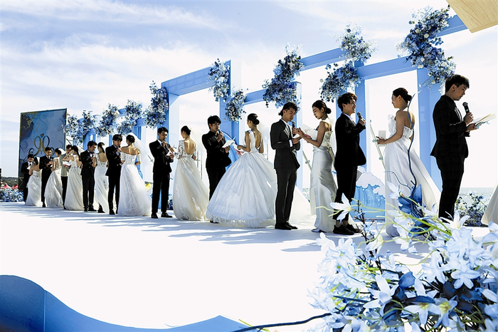 本报讯(李晶晶 大连新闻传媒集团记者郑鸿)10月7日,2021首届中国·大连金石滩国际婚庆节重要活动之一的集体婚礼,10对新人手挽手步入神圣的婚礼殿堂,在主办方和广大游客的见证下,郑重宣读结婚誓词,互换爱的信物,许下一生的承诺。