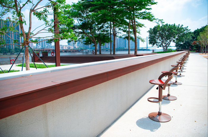 上图为20 世纪50年代矗立于珠江江畔的粮仓活化中拆下来的部分红砖成为沿江碧道的原材料,碧道边上有吧台,有休闲座椅,它们还是防汛墙。