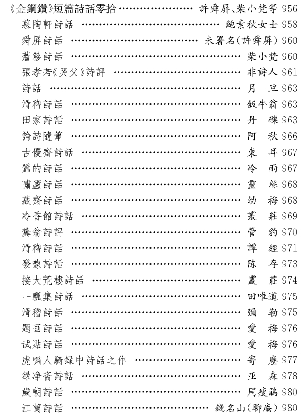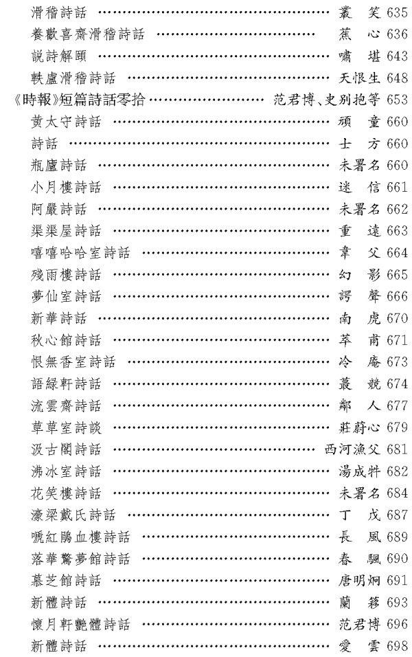 相较,突破了只收“旧体诗”诗话的限定,兼收“新体诗”诗话,体现出编者很强的现代文学整体观。所涉资料也突破书籍,而以民国报刊为主。实际上,民国报刊诗话数量巨大,质量良莠不齐,若单纯求全,不仅短期内难以做到,即使最终完成,也可能会引来“搬运”之诮。综览《诗话卷》选目,除王蕴章《然脂余韵》被《民国诗话丛编》收录外,其余均为首次辑录。其中珍稀诗话颇多,如高旭《愿无尽庐诗话》、徐畹兰《鬘华室诗话》、陈小蝶《香奁诗话》、叶楚伧《诗学述臆》、周瘦鹃《新诗话》、刘永济《旧诗话》、胡怀琛《一叶诗话》、王维克《法兰西诗话》、潘伯鹰《诗话》、赵景深《诗话的诗话》、郑逸梅《服御诗话》、史大木《古今诗话》、陆澹盦《澹盦诗话》、朱亚凤《嘤鸣诗话》、胡石予《炙砚诗话/涤砚诗话》、邓散木《一龛诗话》、沈文炯《翠娱堂诗话》、陈诗《红柳盦诗话》,等等。《诗话卷》选录作品所“话”对象以“旧体诗”为主,也有一些专论“新体诗”,还有的特意融“新”“旧”体诗于一炉,另外还出现了专题诗话、外国诗话和诗话的诗话等,所用语体既有文言,亦有白话,无论是内涵还是形态都很大程度地体现出求新求变的现代性。对于一些流传既广、精编精校的诗话则不再收录,以避重复。很显然,《诗话卷》能在呈现现代诗话整体面貌的同时凸显其最富活力的部分。遍览《丛刊》的其他各卷选目亦是如此,以呈现某类话体的整体面貌及生命活力为鹄的,并希图与其他涉及民国话体文学批评的史料性著作形成互文关系。