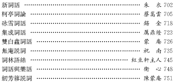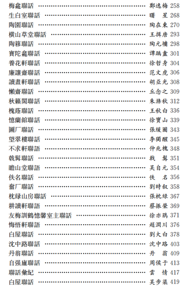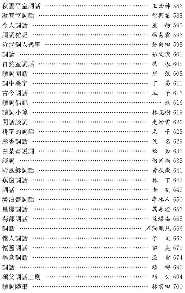 再看《词话卷》,王蕴章是近现代诗词名家,所作《梅魂菊影室词话》(1914)《秋云平室词话》(1933)是正体词话的代表,重在辑录评述历代词人词作词事,兼及考订词集版本、发表词史词论观点。朱衣作为青年词人,所撰《新词话》(1944)可视为变体词话的代表,不仅用白话撰写,而且特意避开使用“含蓄蕴藉”“言外之旨”等传统词学术语来评赏温词。林庚白针对当时词坛弊病而著《孑楼词话》(1933)阐发以平凡通俗之语造自然之美的词学主张,的是深得词学三昧之论。闻野鹤《怬簃词话》(1917-1918)内涵丰富,既对一些近现代词人词作词事加以辑录评析,又对古代词人词作加以品第以声明学词宗尚,还对历代词话进行评价以彰显自己的词学主张。朱剑芒《重阳词话》(1925)、《申江本事词》(1926)、《秋棠室词话》(1926)、《垂云阁恋爱词话》(1928)等,或以“重阳”“恋爱”为专题评析历代绝妙好词,或对历代名篇进行修辞批评,或就身边词友轶事展开记录,充分体现了传统词话“散”的特点。朱鸳雏《双凤阁词话》(1916-1918)以辑评乡邦词人词作词事和评论清代词人为主,保留了与松江及南社相关的不少珍贵词学资料。