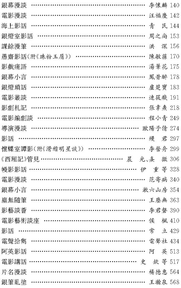的综合艺术论,对如何做好导演进行了比较具体的阐发,具有较强的实践价值和理论价值。李君磐是早期话剧的开创者、电影表演艺术家,其《影艺谈荟》(1932)随谈电影的艺术属性、剧本作法、导演与制片家责任等,多为有识之见。麦黛玲的《麦黛玲影话》(1948-1949)追踪欧美电影前沿,介绍好莱坞、苏联、英国电影及影业情况,大大开拓了国人的电影视野。