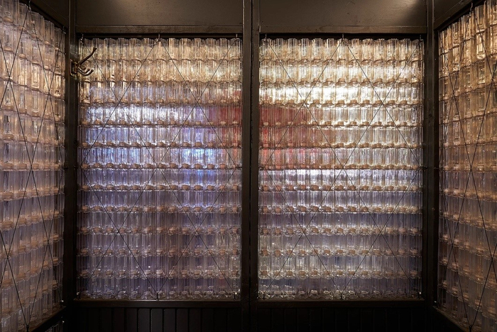 在纽约布鲁克林桃子厨房和酒吧(Peaches Kitchen & Bar)外面的街道上,矗立着两个半透明的户外用餐小房间,好似点亮的超大灯笼。类似的户外用餐空间在新冠大流行期间迅速兴起,供室外就餐社交隔离之用。但与众不同的是,这两个小房间由互相拼接锁定的塑料瓶建造而成,名为“友谊的小屋”。