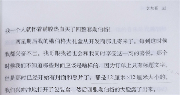 “两星期后我的勋伯格大礼盒从开发商那儿寄来了。每到这时候我都兴奋不已。我哥跟我爸也会和我同时享受这一刻的喜悦。那个时候我们不知道那些封面应该是啥样的,因为订单上只有标题文字。但是那时已经开始有封面和照片了,都是12厘米×12厘米大小的。我们兴冲冲地打开了包装盒,然后四张勋伯格的大脸露了出来。”(55页)原文是:“About two weeks later the box arrived from the distributor. That was always an exciting moment. Marty and I would be joined by Ben, who also enjoyed the moment. In those days we didn’t know what the covers looked like—the order books provided just lists of names. But these were the early days of LPs and artists and photographers had a field day with twelve-by-twelve-inch covers. With great anticipation we tore open the box, and there were the four Schoenbergs.”