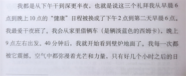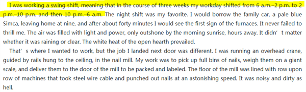80页,格拉斯回忆他在钢铁厂打工的这段:“我都是从下午干到深更半夜,也就是说这三个礼拜我从早晨6点到晚上10点的‘健康’日程被换成了下午2点到第二天早晨6点。”(I was working a swing shift, meaning that in the course of three weeks my workday shifted from 6 a.m.–2 p.m. to 2 p.m.–10 p.m. and then 10 p.m.–6 a.m. )我已无力吐槽,干脆自译献丑:“我的工作需要三班倒,也就是说三个礼拜里,工作时间先是早上六点至下午两点,而后换成下午两点至晚上十点,后来再换成晚上十点至次日早上六点。”