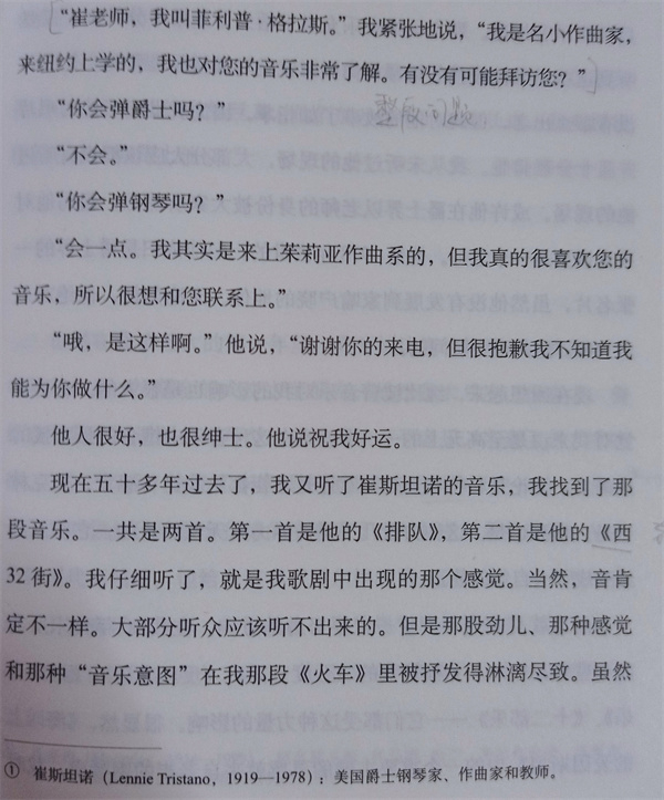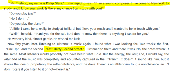 还是57页,原文说:“‘Mr. Tristano, my name is Philip Glass,’I managed to say. ‘ I’m a young composer. I’ve come to New York to study, and I know your work. Is there any chance I can study with you?’”译者或许是替作者着急,觉得他贸贸然打电话给人家,还说要拜师,这太激进了,所以他的译文如下:“‘崔老师,我叫菲利普·格拉斯。’我紧张地说,‘我是名小作曲家,来纽约上学的,我也对您的音乐非常了解。有没有可能拜访您?’”