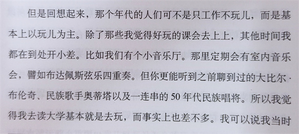 在别人的作品里烙上自己的特色,译者这样的风格有时也会给自己的译文制造别扭。比如62页的这段:“那里定期会有室内音乐会,譬如布达佩斯弦乐四重奏。但你更能听到之前聊到过的大比尔·布伦奇、民族歌手奥蒂塔以及一连串的50年代民族唱将。”反观原文:“There were regular chamber music concerts there—the Budapest String Quartet, for instance, but you could also hear Big Bill Broonzy, Odetta, and a whole raft of fifties folksingers. ”“之前聊到过的”显然是译者强加的装饰和弦,仿佛在提醒读者,如果忘了大比尔·布伦奇是谁那就往前翻一下。“民族歌手”这顶帽子也是二度创作,有乱扣之嫌,毕竟能把音乐语境里的folk译成“民族”而非“民谣”是需要勇气的。我还认真琢磨了folksingers是怎么升级成为“民族唱将”的,按照译者对folk的理解,不该翻成“民族歌手”吗?大概是因为前面他已经帮奥蒂塔戴了“民族歌手”的帽子,而在文学的世界里,重复通常被简单地理解为词穷。