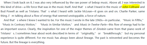 这本书翻译过来有457页,还是删节,删致谢,删索引之后的篇幅。作为一本自传,应该说是诚意十足,而且作者大致是以解剖的方式在展示他的人生。他足够坦诚,愿意在自己的作品里查找那些常人难以发现的师承。他用了很长时间才发现爵士乐是如何渗透进了他的创作:“现在五十多年过去了,我又听了崔斯坦诺的音乐,我找到了那段音乐……就是我歌剧中出现的那个感觉。”(57页)