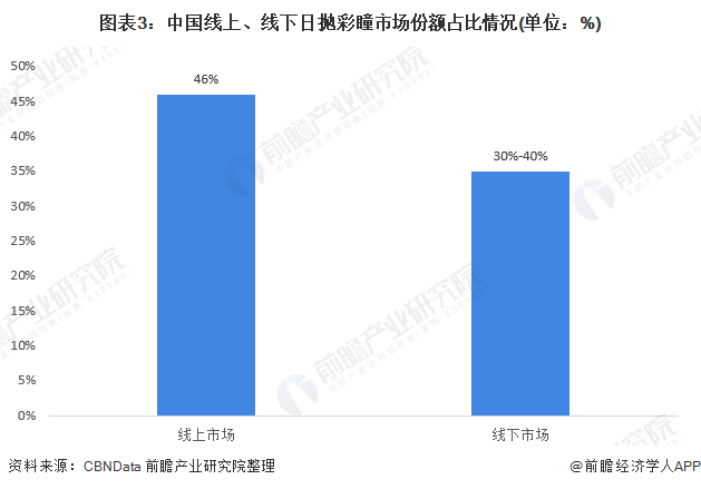 不仅是普通的隐形眼镜在日抛类型的消费占比较大,彩瞳的日抛款隐形眼镜也受到消费者的喜爱,国内日抛彩瞳的市场份额在线上占比仅有46%,线下更低至30%~40%;但是与国际上销售的日抛和月抛的隐形眼镜占比通常超过75%相比,我国日抛彩瞳市场仍有巨大的增长空间。