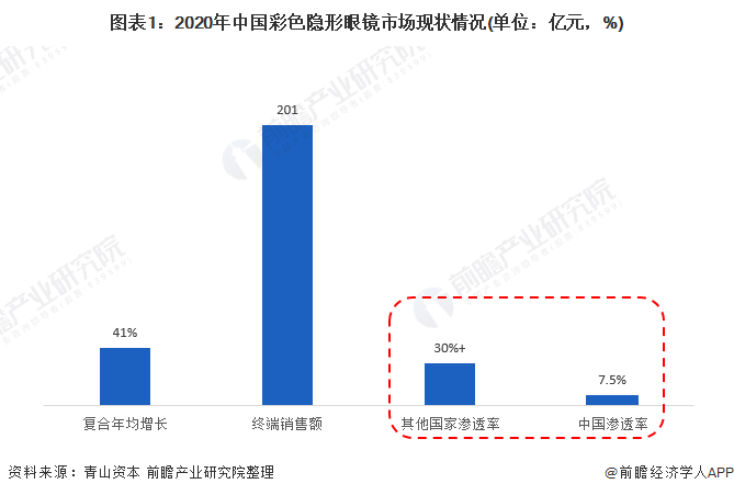 在被彩色隐形眼镜被大众化后,彩/美瞳逐渐从医疗用品转变为年轻消费者化妆标配“美妆产品”,所面向的巨大的消费市场。据青山资本数据显示,近五年,美瞳的复合年均增长值高达41%,2020年终端销售额超200亿。而相比较其他国家高到30%+的渗透率,中国美瞳市场渗透率仅7.5%,还拥有着5-7倍的成长空间。