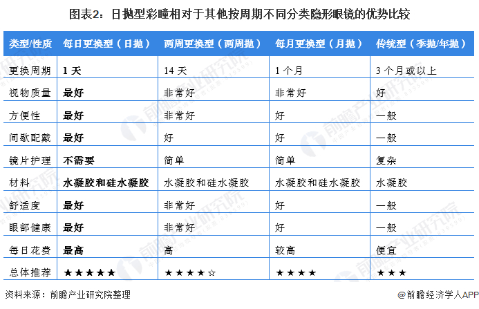 日抛型彩色隐形眼镜相对于其他按周期不同分类隐形眼镜的优势比较如下: