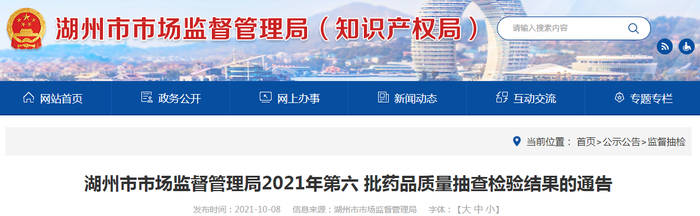 中国质量新闻网讯 2021年10月8日,浙江省湖州市市场监督管理局网站发布2021年第六批药品质量抽查检验结果的通告。